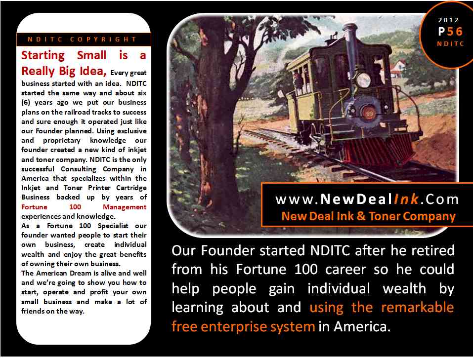 NDITC New Deal Ink and Toner Company has found a ready market within the small business community for our business plans and designs because you can operate as an Home Based Business or a Commercial Main Street Business without all the expenses, infrastructure costs, personnel costs and you never need a lawyer or any equipment other than a personal computer.